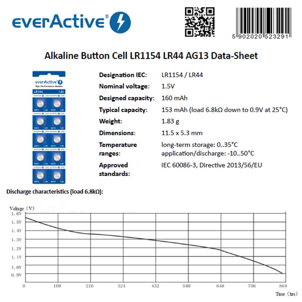 Ce lot de 10 piles EverActive AG13 1,5V garantit une excellente capacité énergétique, une faible autodécharge et une compatibilité universelle avec tous les appareils utilisant le format AG13 / LR44 / LR1154. Equivalence : LR1154, LR44, AG13, G13, A76, PX76A, 76A, L1154, UL76A, V13GA, G13A